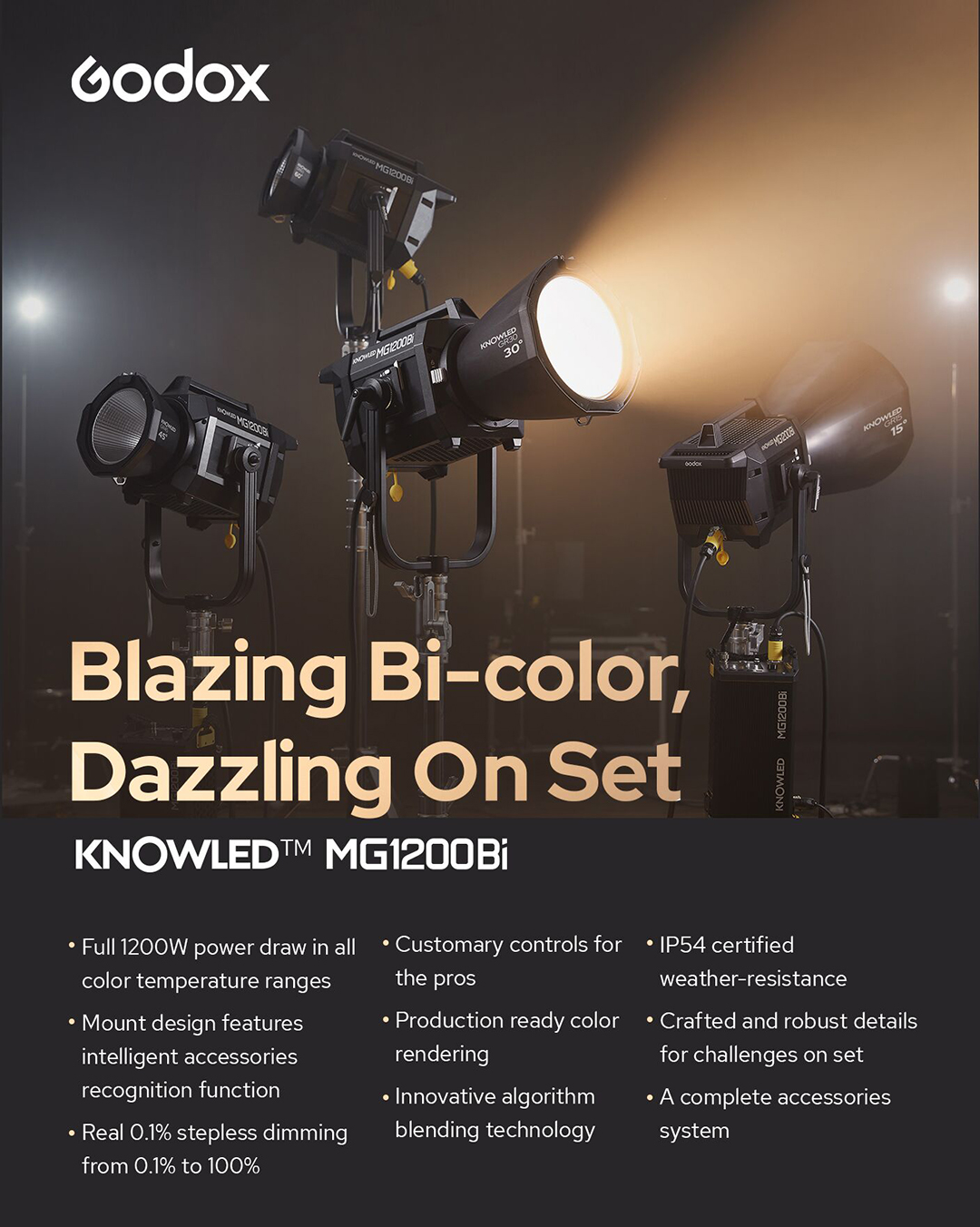 MG1200Bi is Godox's brightest and most powerful light ever, with 1200-watt output power at all ranges and bicolor temperature settings from 2700K to 7000K. MG1200Bi’s beam angle reaches 120°.