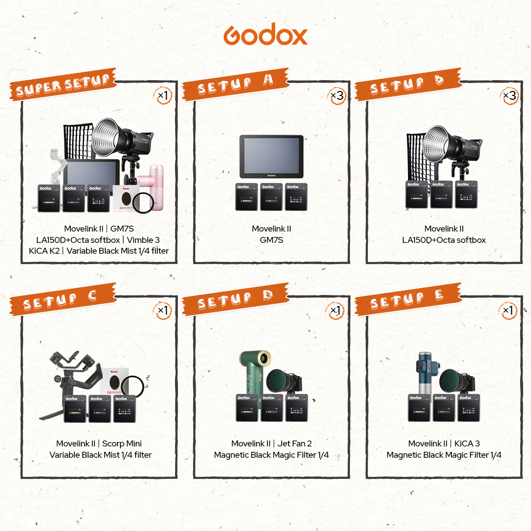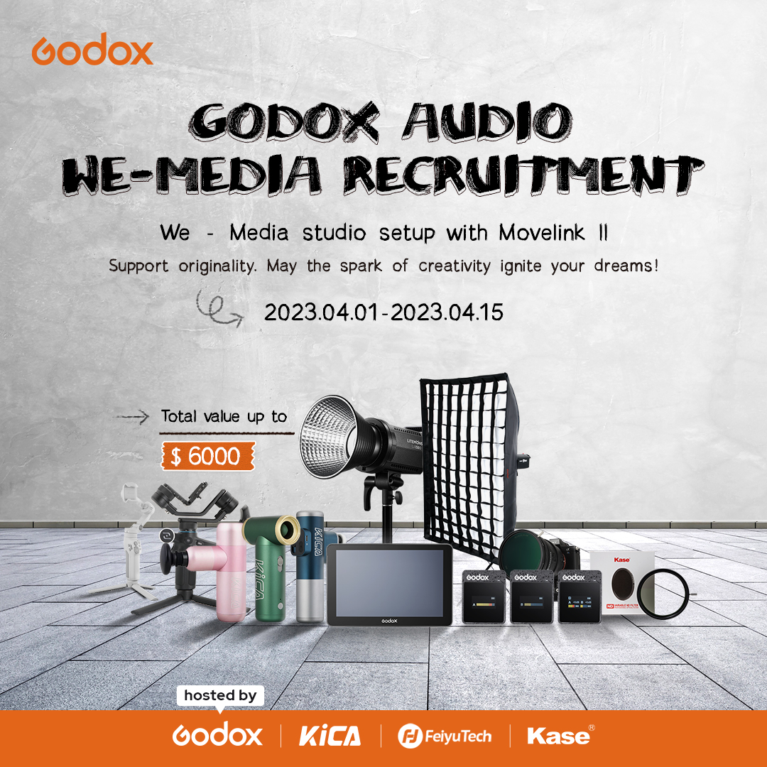 Hey creators! It’s show time! Come and join our call-for-idea activity “We- Media studio setup with Movelink II”! This event is jointly launched by Godox Audio, Godox, FeiyuTech, Kica and Kase Filters!!