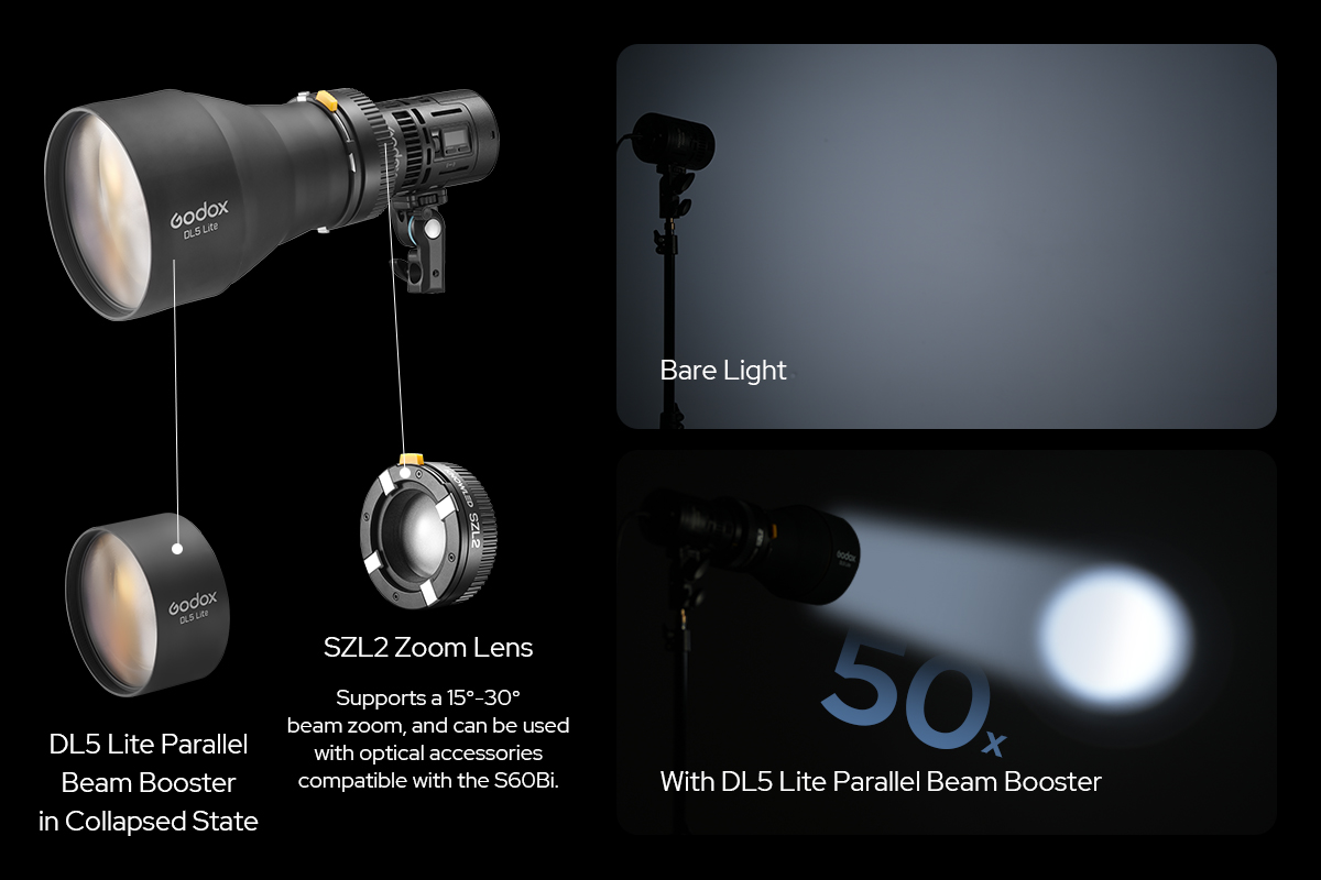 The DL5 Lite Parallel Beam Booster, paired with the SZL2 zoom lens, provides a 5° beam angle and significantly increases brightness by approximately 50 times. Lightweight and collapsible, it is easy to store and adaptable to various shapes.