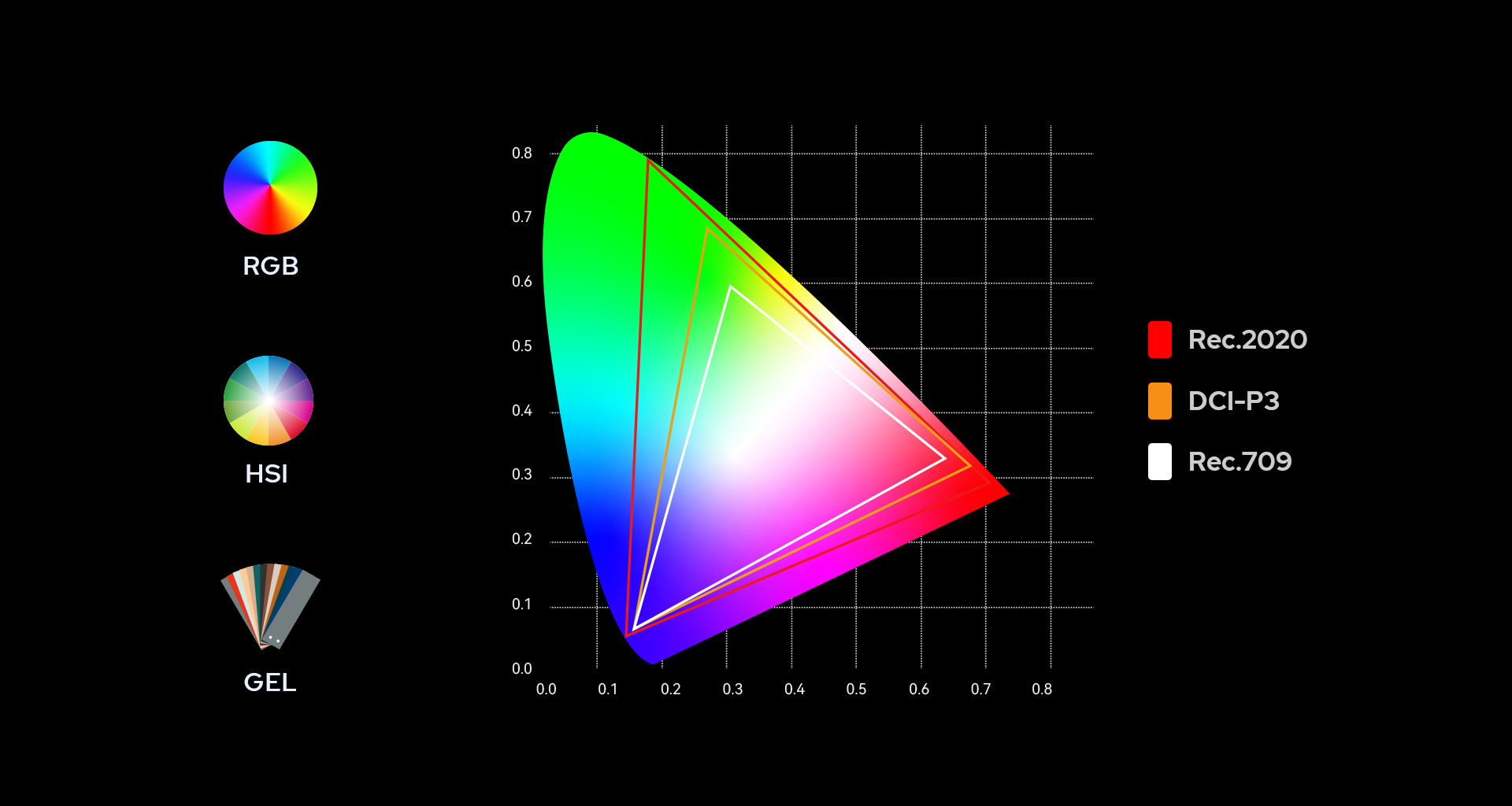 Featuring four color modes: HSI, RGBW, GEL, and X-Y. It supports multiple color spaces including Rec.2020, DCI-P3, and Rec.709, achieving 96% Rec.2020 coverage and meeting the cinematic production standard DCI-P3. Adjust according to specific needs for accurate color presentation.