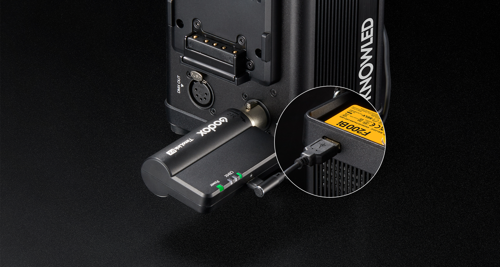 It has 48V DC input that supports power supply from an external power stations. And the upgraded Type-A interface can be used to upgrade the firmware of the fixture, as well as to power the wireless DMX receiver for continuous on-set operation.