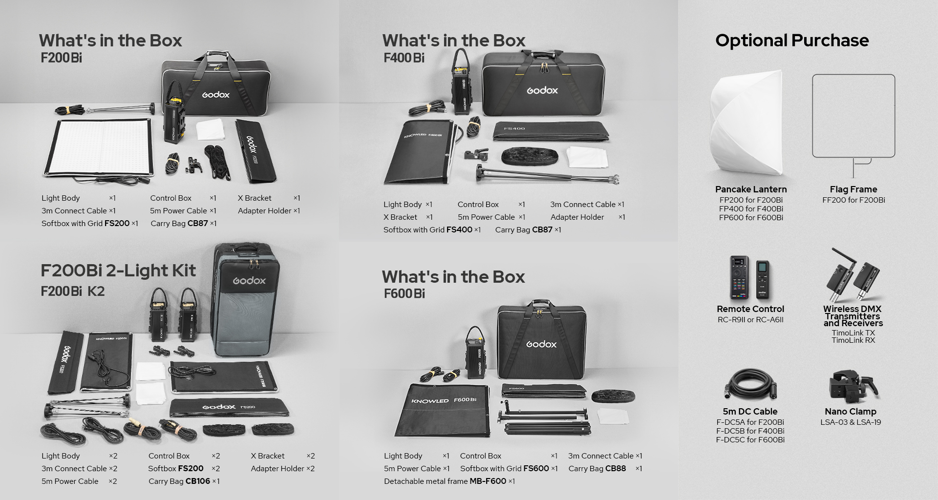 | Netweight≈ | Light Body: 1.83kg (including X bracket and adapter) Controller: 2.77kg | Light Body: 3.1kg (including X bracket) Controller: 3.07kg | Light Body: 3.8Kg Controller: 3.9Kg |