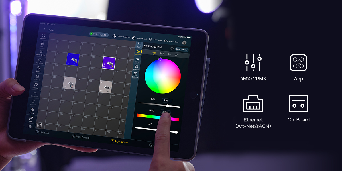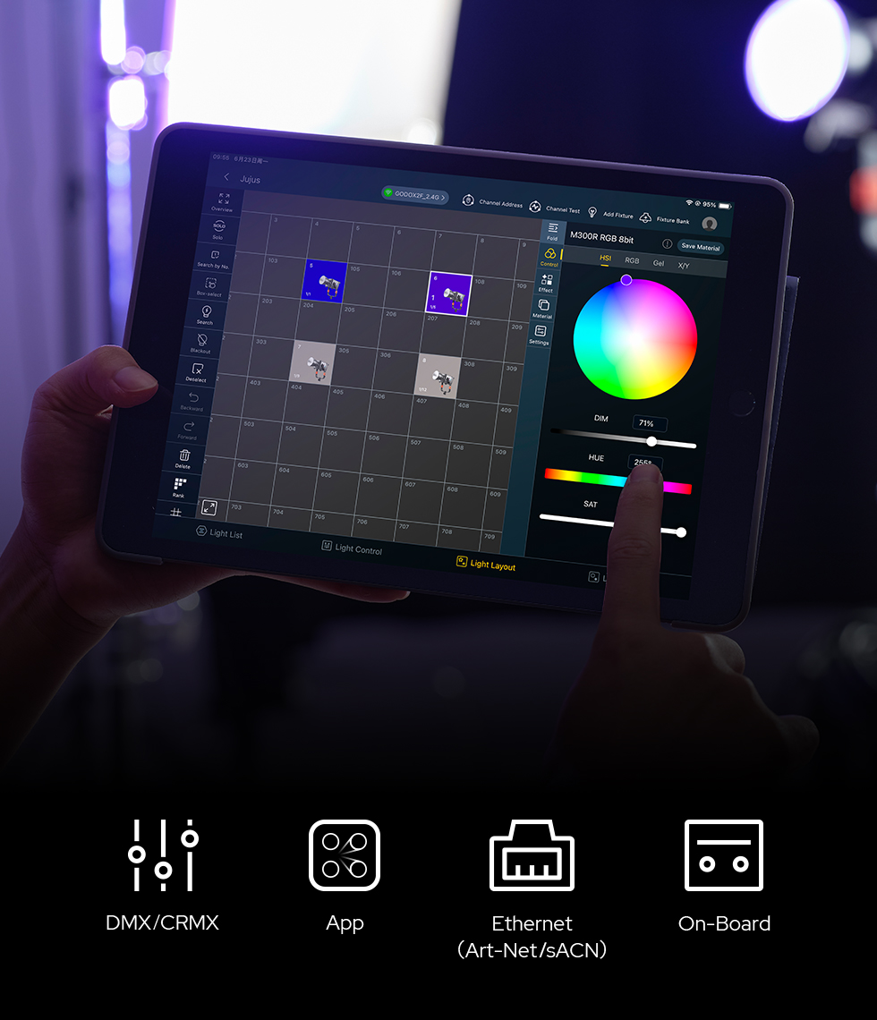 | Controlling Methods | DMX 512 controller, support RDM protocol/LumenRadio CRMX/Etherne/Art-Net&sACN protocol /Bluetooth app/controller control |
